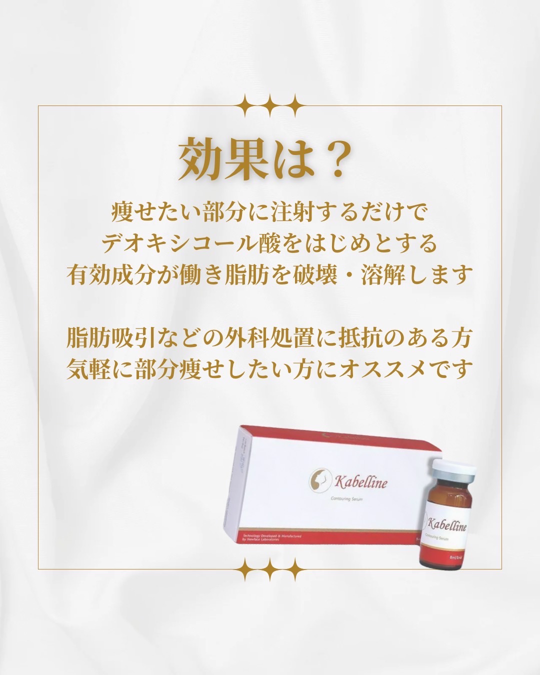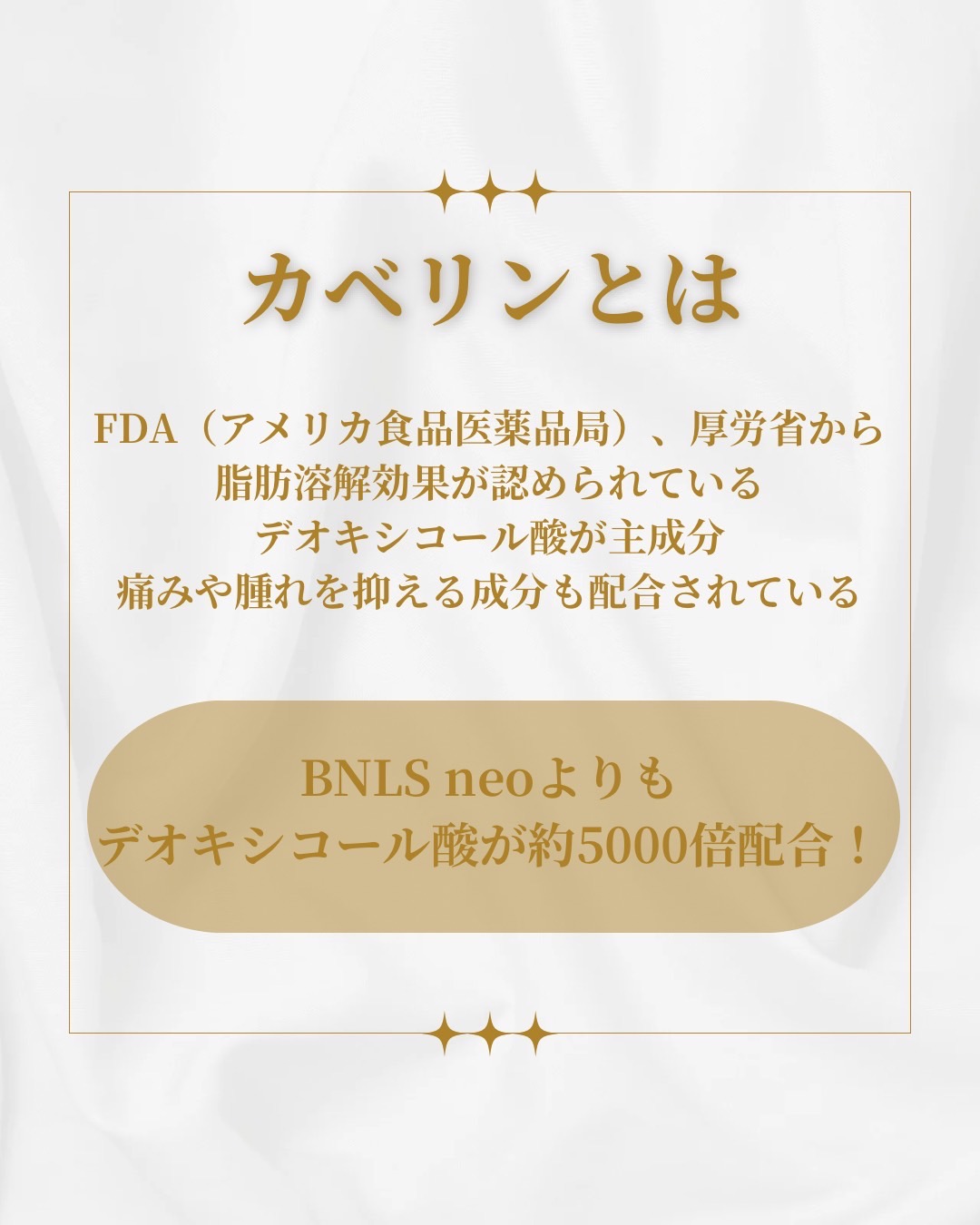 カベリンの主成分は、アメリカFDAより脂肪溶解効果が認められている「デオキシコール酸」です。カベリンは、高濃度にデオキシコール酸が0.5%配合されていましは。そのため、高い痩身効果を期待できます。