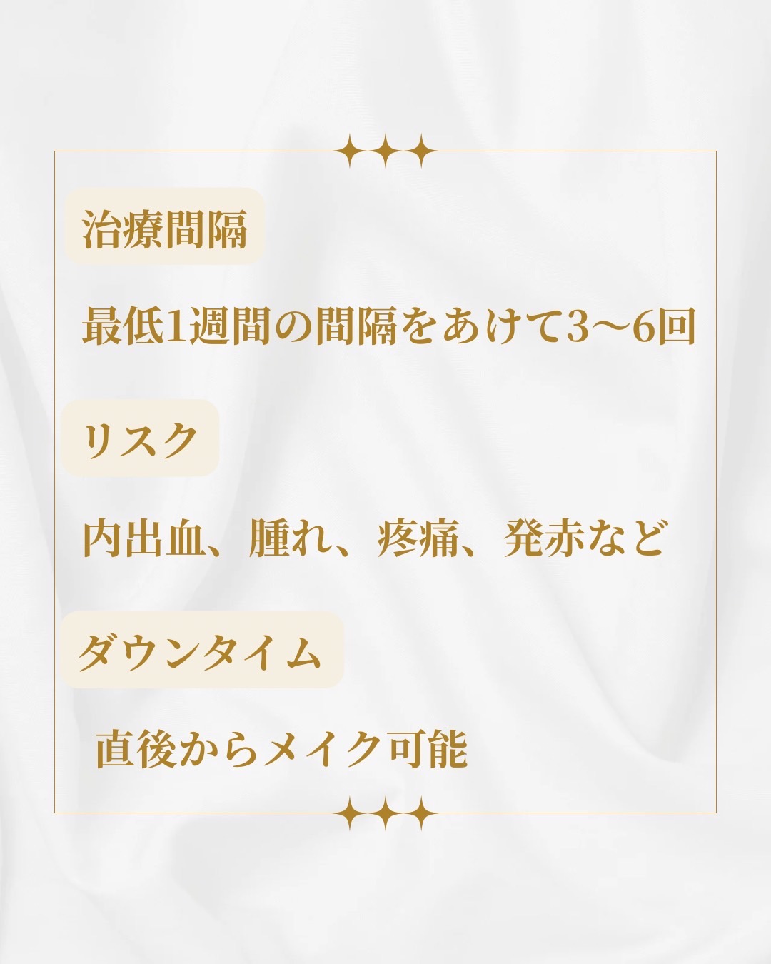 - 内出血:微細な針による血管損傷で、内出血が見られることがあります。内出血も通常は数日から1週間で回復します。